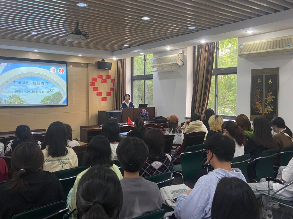 10月25日下午,学院党委书记李璐岚为外国语学院2022级新生开讲“生逢其时,绽放青春”。2022级部分学生代表参加了本次思政课。